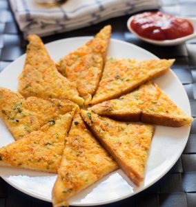 প্রথমে সব উপকরণ গুলি ভালো করে ধুয়ে কুঁচি কুঁচি করে কেটে নিন।একটি বড়ো বাটিতে সুজি নিয়ে এর মধ্যে দই,নুন,গোলমরিচ,আর সব সবজি মিশিয়ে নিয়ে ভালো করে ফেটিয়ে ব্যাটার বানিয়ে নিন।এইভাবে ১৫ মিনিট রেখে দিন।খেয়াল রাখবেন যাতে সুজি যেন দইয়ে ভালো করে ভিজে যায়।এরপর পাউরুটিতে হালকা করে মাখন মাখিয়ে নিন।ফ্রাই প্যানে ঘি দিয়ে গরম করুন।পাউরুটি গুলি ওই ব্যাটারে ডুবিয়ে কোট করে নিন ভালো করে।তারপর কম আঁচে এপিঠ ওপিঠ করে মুচমুচে করে ভেজে নিন।ভাঁজা হয়ে গেলে লম্বা লম্বা করে কেটে টোম্যাটো সসের সঙ্গে পরিবেশন করুন।