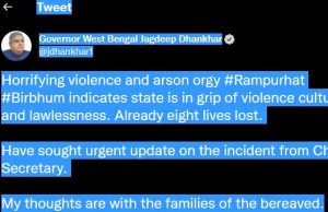 সময় কলকাতা ডেস্কঃ বীরভূমের রামপুরহাট ১ নম্বর ব্লকের বরশাল গ্রাম পঞ্চায়েতের উপপ্রধান ভাদু সেখের মৃত্যু এবং পরে এলাকায় রাতভর দফায় দফায় বোমাবাজি ও বিভিন্ন বাড়িতে অগ্নিসংযোগের ঘটনায় গভীর উদ্বেগ প্রকাশ করলেন রাজ্যপাল জগদীপ ধনখড়। মঙ্গলবার তিনি একটি ভিডিয়ো বার্তায় নিজের উদ্বেগের কথা জানান তিনি। একইসঙ্গে তিনি এব্যাপারে তাঁকে সম্পূর্ণ রিপোর্ট দিতে মুখ্যসচিবকে নির্দেশ দিয়েছেন তিনি। এদিন ভিডিয়ো বার্তায় রাজ্যপাল জানিয়েছেন, মুখ্যসচিবের কাছে তিনি এই বিষয়ে বিস্তারিত তথ্য চেয়ে পাঠিয়েছেন করেছেন । শুধু তাই নয়, এই ঘটনাকে ভয়ঙ্কর ও নৃশংস বলেও ব্যাখ্যা করেছেন তিনি। রামপুরহাটের ঘটনা সামনে আসার পরেই সোশ্যাল মিডিয়ার মাধ্যমে একটি বার্তা দিয়েছেন রাজ্যপাল। সেখানে কার্যত রাজ্যের আইনশৃঙ্খলা নিয়ে প্রশ্ন তুলেছেন তিনি। রাজ্যপাল বলেন, রাজ্যে আইনের শাসন নেই। এই ঘটনায় স্পষ্ট রাজ্যে মানবাধিকার বিপন্ন। সন্ত্রাসের সংস্কৃতি চলছে বলেও রাজ্য প্রশাসনের তীব্র সমালোচনা করেন রাজ্যপাল ।