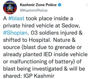 বিস্ফোরণটি শোফিয়ানের সেডোতে একটি ব্যক্তিগত ভাড়া করা গাড়ির মধ্যে ঘটেছে। একটি শপিং মলের সামনে দাঁড় করানো ছিল গাড়িটি, তার পাশেই ছিল একটি পুলিশ গাড়ি, যে পুলিশ গাড়িতে পাঁচজন পুলিশ টহলদারীতে ছিলেন। গ্রেনেড ছুঁড়ে বিস্ফোরণ ঘটানো হয়েছে নাকি আইইডি দিয়ে রিমোট কন্ট্রোলের সাহায্যে বিস্ফোরণ ঘটানো হয়েছে সে বিষয়ে তদন্ত করে দেখছে কাশ্মীর পুলিশ।