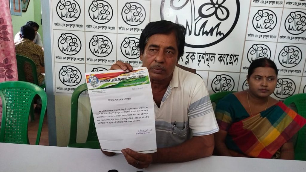 সুজয় ভট্টাচার্য, সময় কলকাতা ,১১ সেপ্টেম্বর : দলবিরোধী কাজের জন্য তৃণমূল দল থেকে বহিস্কৃত হলেন স্থানীয় তৃণমূল নেতা।যাকে বহিস্কার করা হল তিনি আবার এই সিদ্ধান্ত মানতে নারাজ এবং সরাসরি বিষয়টি অভিষেক বন্দ্যোপাধ্যায়ের কাছে নিয়ে যেতে চান । পূর্ব বর্ধমানে এই ঘটনায় ছড়িয়েছে চাঞ্চল্য।পূর্ব বর্ধমানের বৈকুণ্ঠপুর ১ নম্বর অঞ্চলের ঘটনা। এখানে দুই নম্বর ব্লকের জোতিরাম বাম গ্রামের ২২৫ নম্বর বুথের বুথ সভাপতি শেখ রাজু কে দল বিরোধী কাজের জন্য বহিষ্কার করা ৩ বছরের জন্য।
