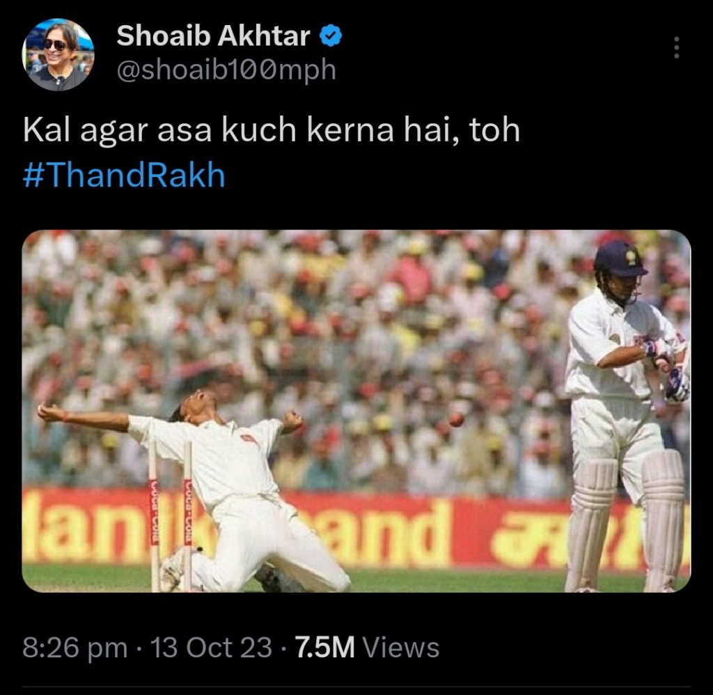 শনিবার চলতি বিশ্বকাপে নিজেদের তৃতীয় ম্যাচে মুখোমুখি হয়েছিল ভারত বনাম পাকিস্তান। একটি টানটান উত্তেজনাপূর্ণ ম্যাচ দেখার অপেক্ষায় ছিল দুই দেশের আপামর ক্রিকেট ভক্তরা। নিজেদের দলের ক্রিকেটারদের তাতাতে কসুর করেননি সমর্থক থেকে দুই দলের প্রাক্তনী সকলের। শুক্রবার রাত ৮.২৬ টা নাগাদ এক্স হ্যান্ডেলে একটি ছবি পোস্ট করেন শোয়েব। সেই ছবিটি পুরনো ভারত বনাম পাকিস্তান টেস্ট ম্যাচের। যেখানে দেখা যাচ্ছে সচিনকে আউট করার পর উল্লাস করছেন করছেন শোয়েব। ক্যাপশনে লেখেন, “কালকে এরকম কিছু করতে হলে ঠান্ডা রাখুন।”