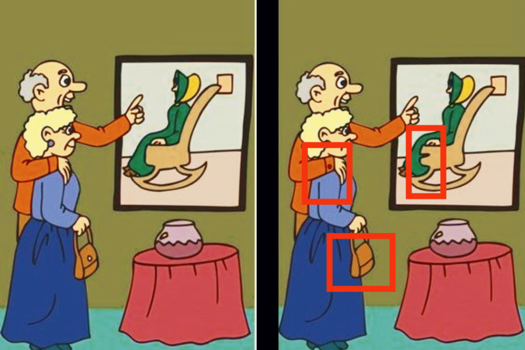 উপরে দেওয়া ছবিটিতে আপনি একজন বৃদ্ধ দম্পতিকে দেখতে পাবেন। যাঁরা ছবি প্রদর্শনীতে গিয়েছেন। তাঁদের সামনে রয়েছে একটি স্থির চিত্র। চিত্রে দেখে যাচ্ছে একজন বৃদ্ধাকে চেয়ারে বসে থাকতে। দুটি ছবি প্রথম নজরে প্রায় একই রকম। যাইহোক, আপনি যদি মনোযোগ সহকারে লক্ষ্য করেন তবে আপনি দেখতে পাবেন যে দুটি ছবির মধ্যে কিছু পার্থক্য রয়েছে। পাঠকদের জন্য চ্যালেঞ্জ হল ১০ সেকেন্ডের মধ্যে দুটি ছবির মধ্যে তিনটি পার্থক্য চিহ্নিত করা।