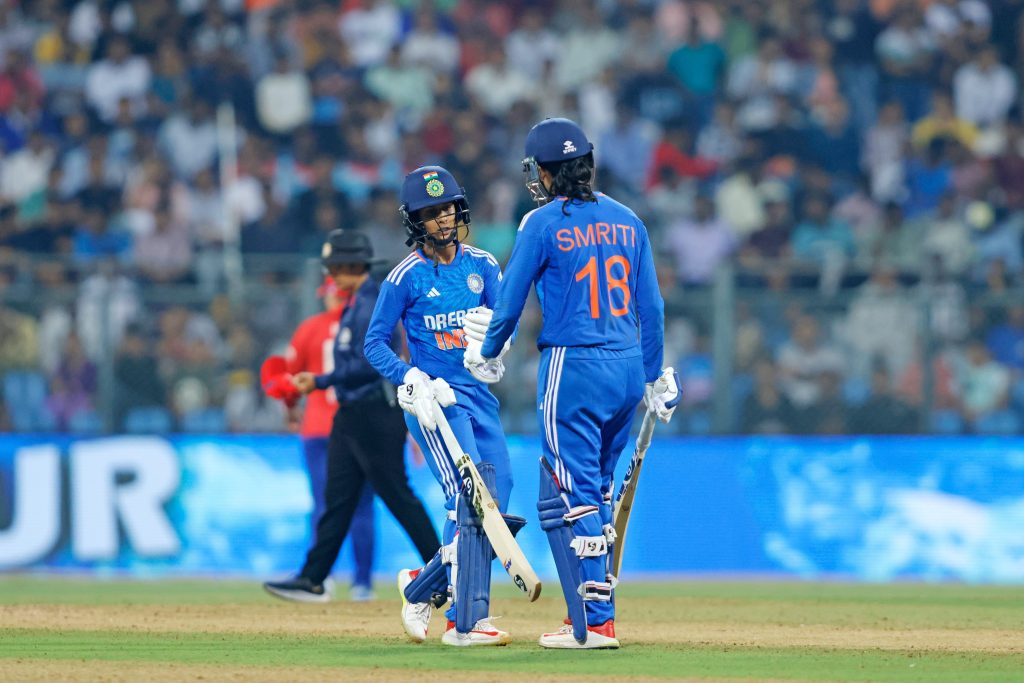 ইংল্যান্ডের দেওয়া ১২৭ রানের লক্ষ্য মাথায় নিয়ে খেলতে নেমে শুরুতেই ধাক্কা খায় ভারত। তৃতীয় ওভারে আউট হন শেফালি বর্মা। দ্বিতীয় ম্যাচের পর এই ম্যাচেও রান পেলেন না তিনি। ফিরলেন ৬ রানে। এরপর স্মৃতি মন্ধানার সঙ্গে দলের স্কোরবোর্ড এগিয়ে নিয়ে যান জেমাইমা রদ্রিগেজ। দ্বিতীয় উইকেটে ৫৭ রানের জুটি গড়েন তারা। স্মৃতি করেন ৪৮ রান। ৫ টি চার ও ২ টি ছয় মারেন তিনি। জেমাইমার ব্যাট থেকে আসে ২৯ রান। চার নম্বরে নেমে ১২ রান করেন দীপ্তি শর্মা। তিনি ফিরলে দলের জয় নিশ্চিত করেন হরমনপ্রীত কউর ও আমনজ্যোৎ কউর। ৪ বলে ১০ রান করে অপরাজিত থাকেন অমনজ্যোত। উল্টোদিকে ৬ রান করে অপরাজিত থেকে যান ভারত অধিনায়ক।