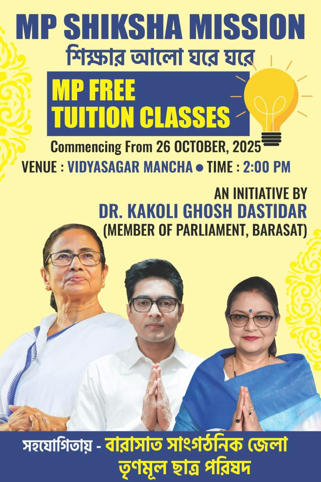 দেশ ও জাতির উন্নতির জন্য পৌঁছে যাক শিক্ষার আলো ঘরে ঘরে। তবুও এই আলোতে আলোকিত হওয়ার পথে বাধা অনেক। মেধাবী দুঃস্থ ও গরীব ছাত্র ছাত্রীদের শিক্ষা কে আত্মস্থ এবং আরও ভালো ফল করতে দরকার হয় ভালো ও উপযুক্ত গৃহ শিক্ষকের বা হোম টিউটরের।অথচ অর্থের অভাবে অনেকেই এই সুযোগ নিতে পারে না, প্রয়োজন অপূর্ণ থেকেই যায় । অর্থ প্রতিবন্ধকতার সৃষ্টি করে। এমপি শিক্ষা মিশনের প্রচেষ্টায় এই বাধা কাটিয়ে নেওয়ার উদ্যোগ।।এমপি শিক্ষা মিশনের আওতায় শিক্ষার আলো সবার কাছে পৌঁছে দেওয়ার জন্য ফ্রি টিউশন ক্লাসের ব্যবস্থা করেছেন বারাসাত সংসদীয় ক্ষেত্রের সাংসদ কাকলি ঘোষ দস্তিদার। কাকলি ঘোষ দস্তিদারের বক্তব্য, আজ থেকে পঞ্চাশ বছর আগে শিক্ষাক্ষেত্রে যে সুযোগ তারা পাননি সেই সুযোগ থেকে যেন বঞ্চিত না হয় বর্তমান প্রজন্মের ছাত্র-ছাত্রীরা। তাই উপযুক্ত টিউটরদের দিয়ে নিখরচায় ছাত্র-ছাত্রীদের মধ্যে শিক্ষার আলো ছড়িয়ে দেওয়ার উদ্যোগ এমপি শিক্ষা মিশনের মাধ্যমে। বারাসাতের বিদ্যাসাগর মঞ্চে হোম টিউটরদের পুরস্কৃত ও উদ্বুদ্ধ করে কাকলি ঘোষ দস্তিদার দরজা খুলে দিলেন শিক্ষার আলো প্রবেশের। ছড়িয়ে দিলেন শিক্ষা ও জ্ঞানের বার্তা, মেধা বিকাশের বার্তা। এই আকাশে আলোয় আলোয় মুক্তির পথ সাংসদের হাত ধরে।।
