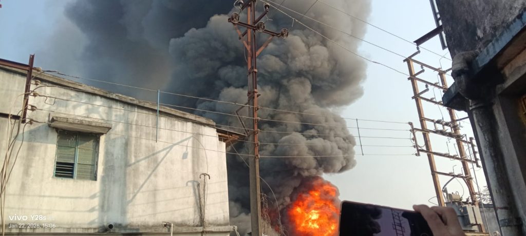 সময় কলকাতা ডেস্ক, ২২ জানুয়ারি : বৃহস্পতিবার দুপুরের আগেই মধ্যমগ্রামে বাদুর আকাশ কালো হয়ে গিয়েছে লাল আগুনের ছটায়। রংয়ের কারখানার গুদাম থেকে আগুন উত্তর ২৪ পরগনার মধ্যমগ্রামে।